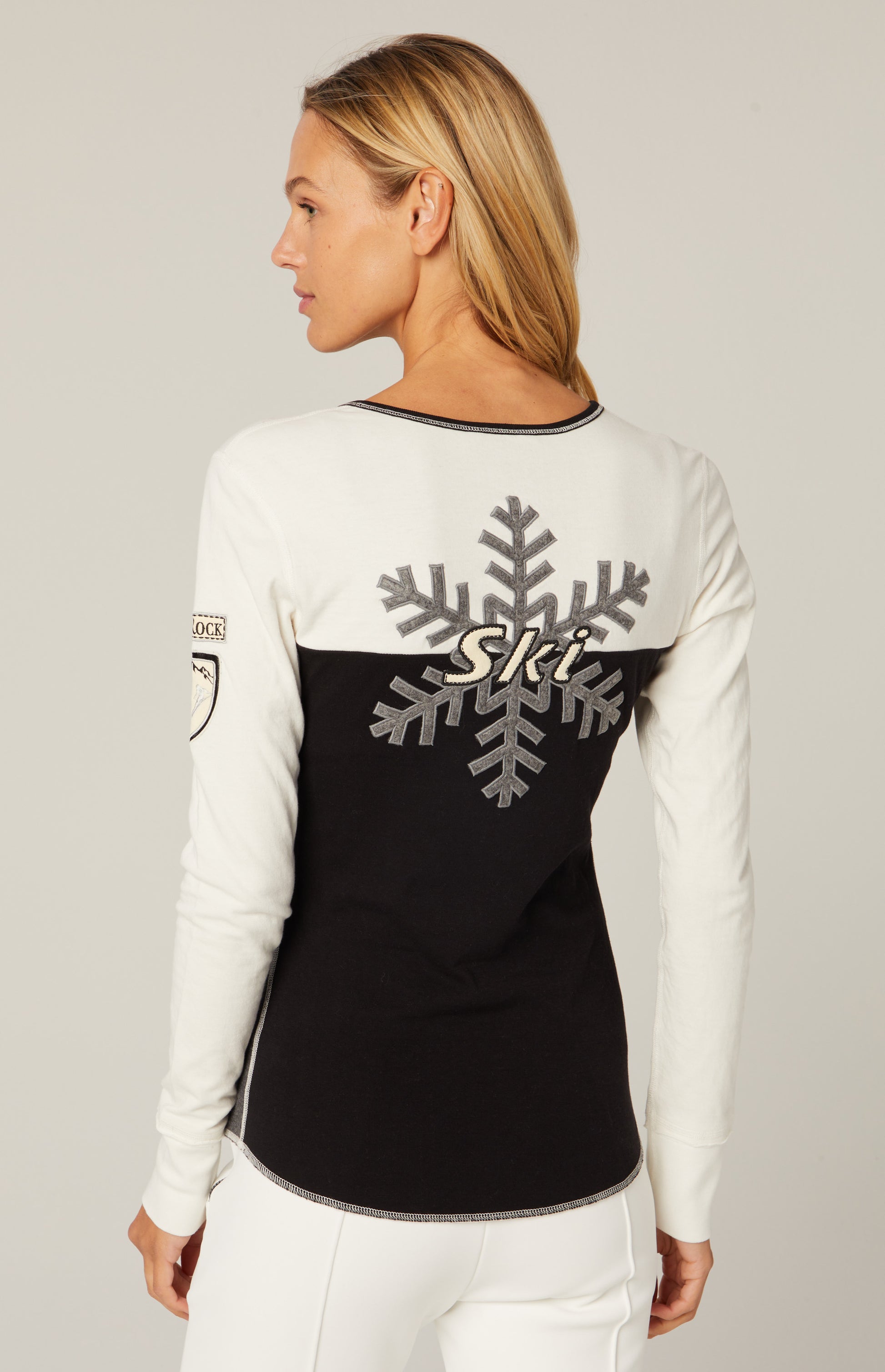 Longsleeve season. Inspired by the dynamic energy of après-ski culture, this top features a sporty cut with detailed alpine-inspired patches and snowflake embroidery. Our most-loved henley silhoutte ensures a flattering fit, with carefully formulated fabrication designed to keep you warm and stylish from the slopes to the lodge.