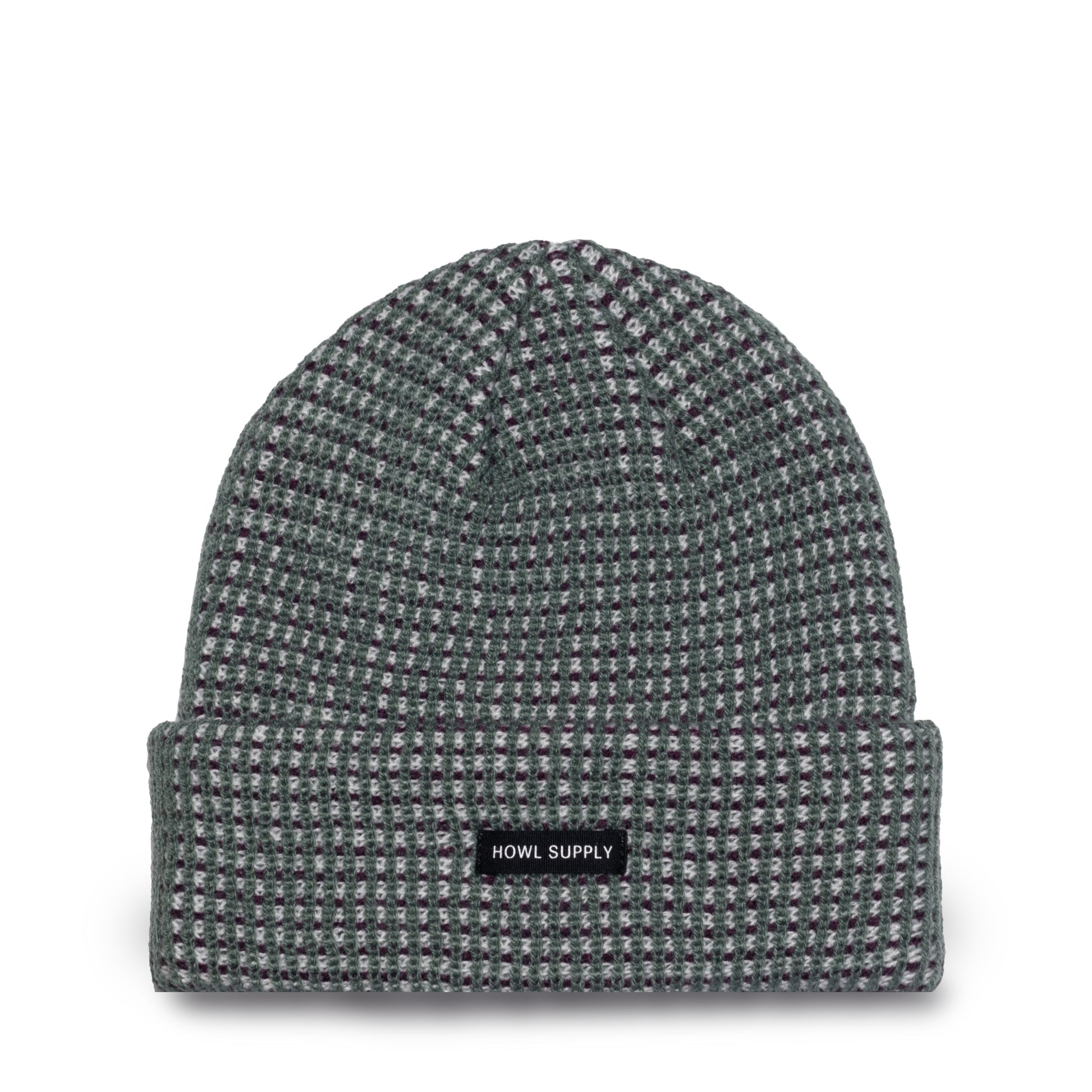 Acrylic cuff beanie with rib knit and HOWL woven label.