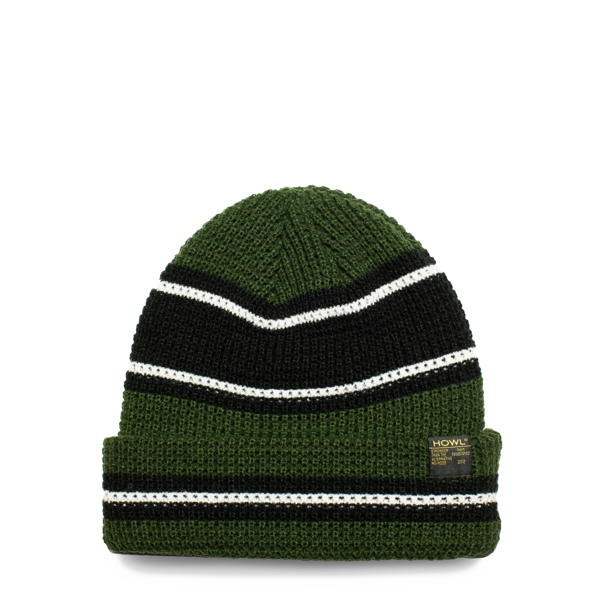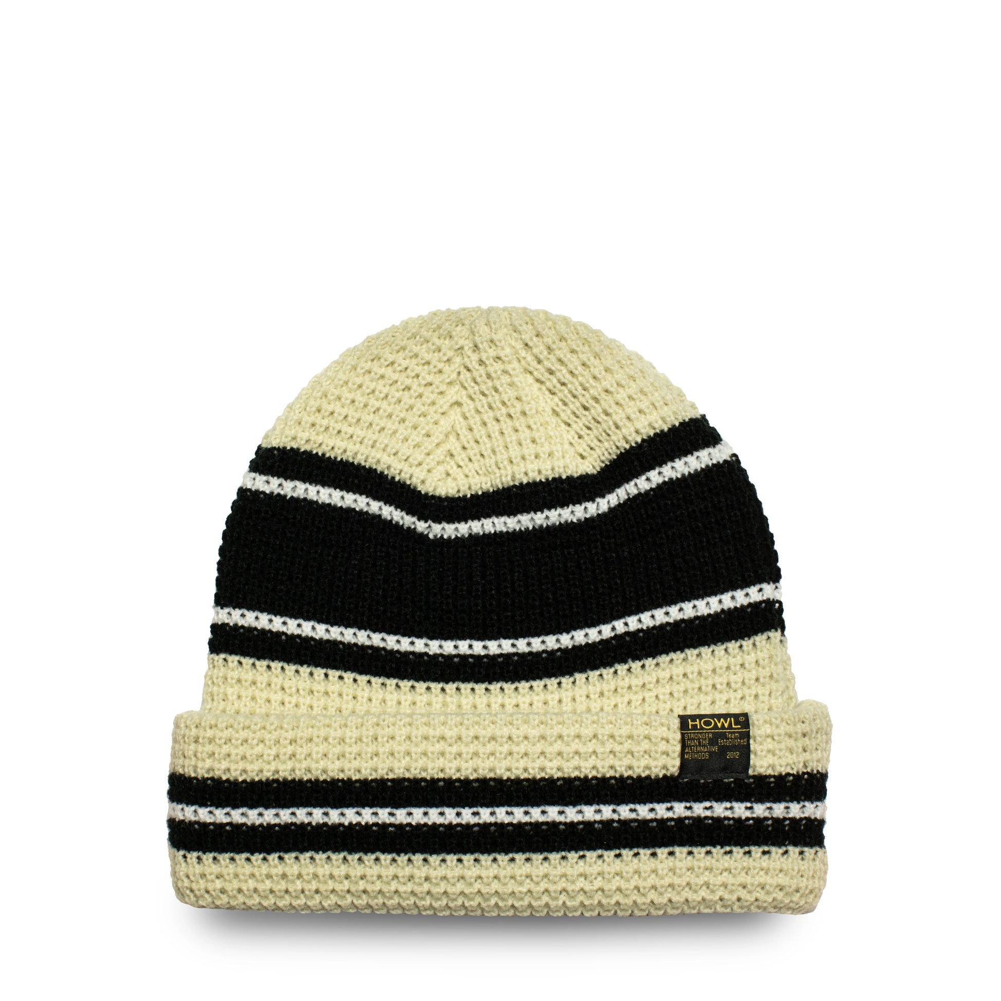 Acrylic waffle knit with engineered stripes, side seam construction with woven flag label