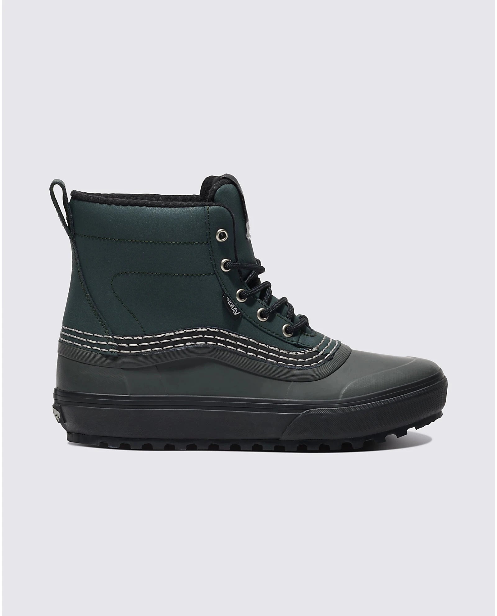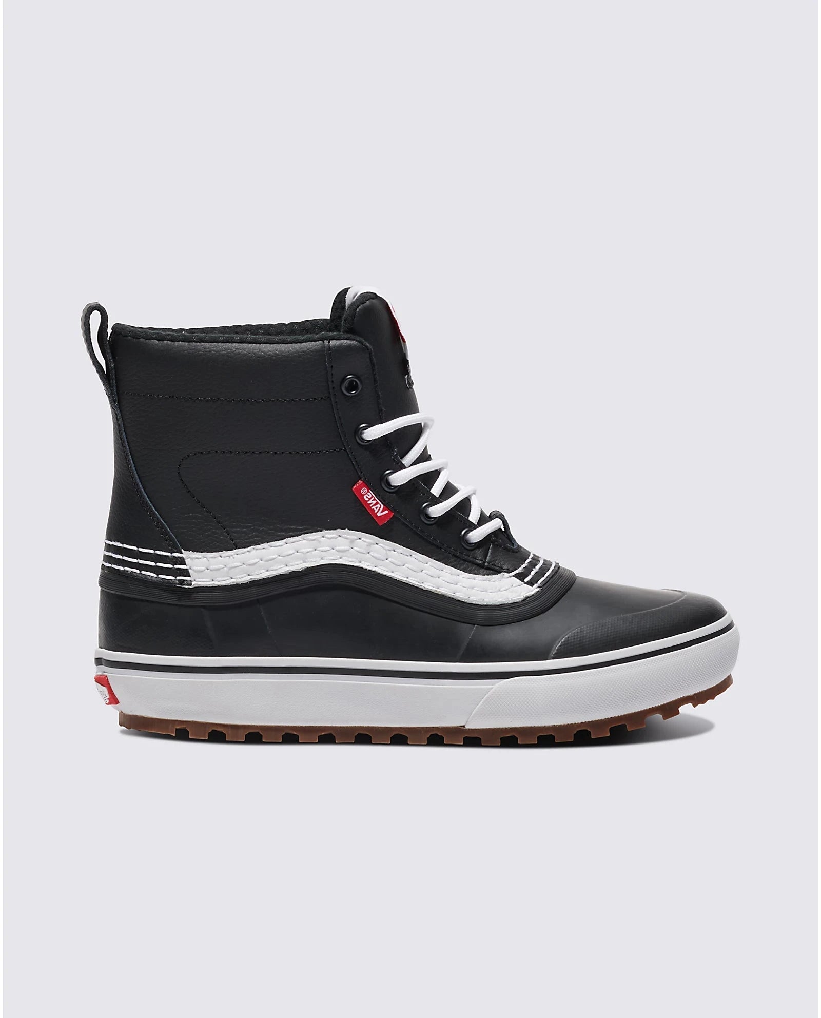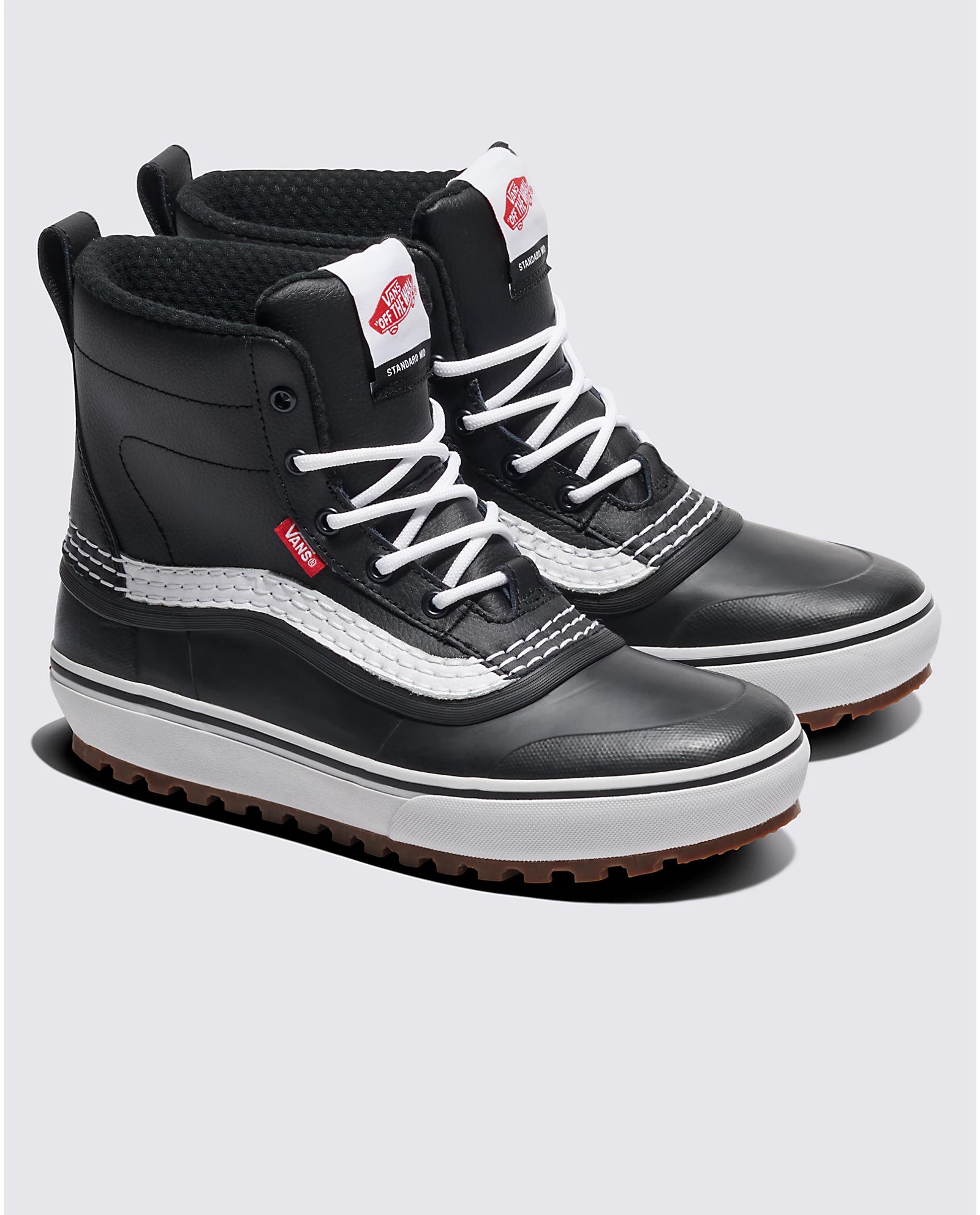 Practical, packable, and wear-at-the-bar-able, the MTE Standard Mid Waterproof Boot is a downsized version of Vans’ best-selling Standard snow boot. With a waterproof vulcanized lower, waterproof seam-sealed construction, 100-gram weight insulation package, and a Standard Snow MTE outsole featuring All-Trac all-terrain rubber, classic Vans style and day-to-day winter weather footwear have finally converged. This mid top boot is made with leather and rubber uppers.