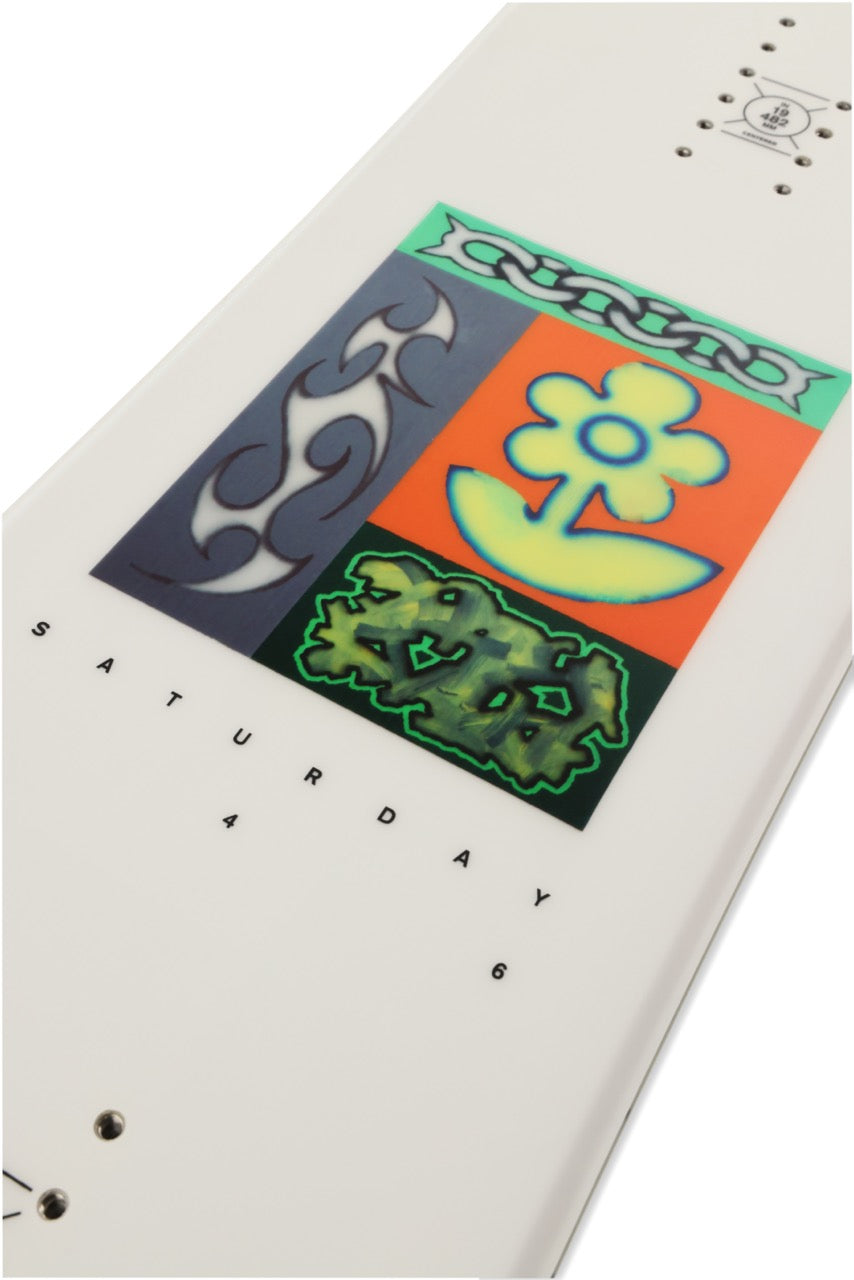 The Saturday is a twin shape that is at home anywhere on the mountain. The standard camber profile provides camber between your bindings for snap and control and rocker at the tip and tail for catch-free riding and float. A Quadratic Sidecut improves turn initiation and exit as well as edge grip. Slimewalls® provide a smooth ride and increase durability by absorbing impact. Carbon Array 3™ provides extra pop and control without adding stiffness. The Saturday is a mid-flexing twin built for the intermediate to advanced riders that want one board for all conditions.