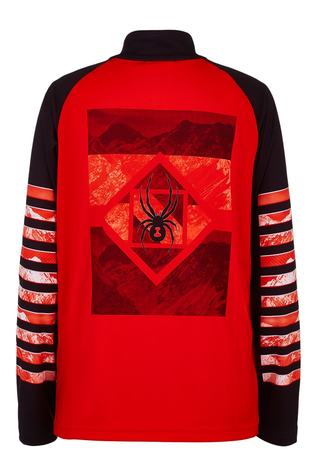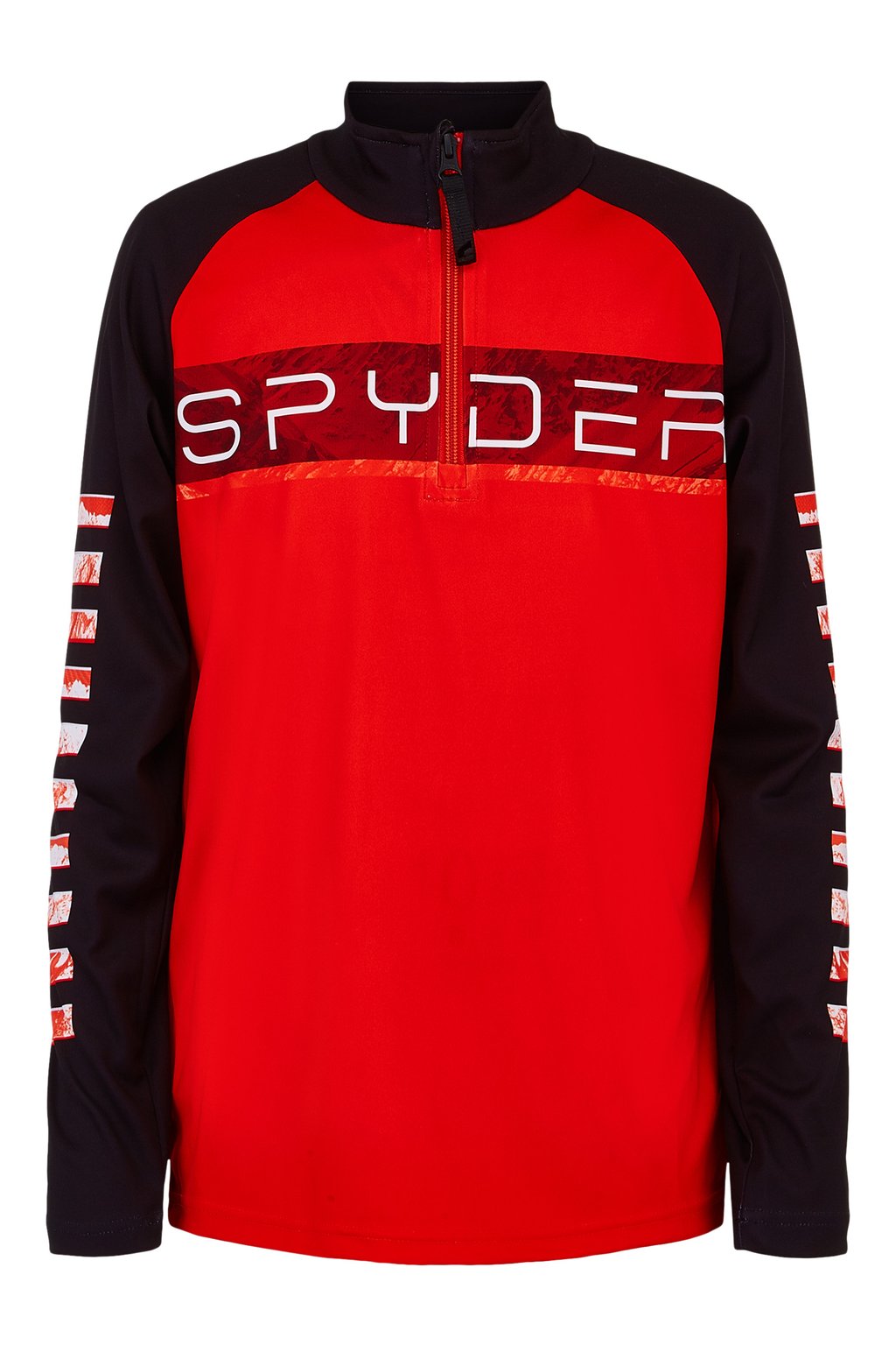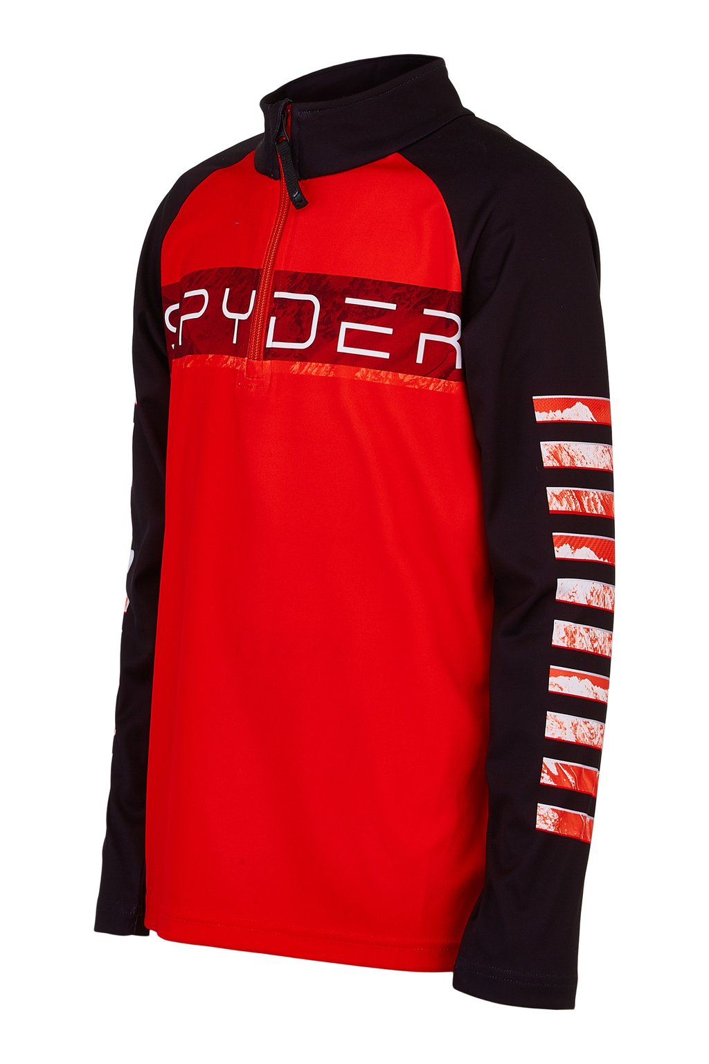 DESIGNED FOR DRY WEARING WARMTH, THE PEAK KEEPS KIDS ON THE MOVE THANKS TO ITS STRETCH POLYESTER INTERLOCK CONSTRUCTION. IT WICKS MOISTURE AND DRIES QUICKLY, KEEPING THEM COMFORTABLE AND PROTECTED DURING HIGH OUTPUT COLD WEATHER FUN. CUSTOM MOUNTAIN AND SPYDER LOGO GRAPHICS ARE FEATURES ON FRONT, BACK AND BOTH SLEEVES. A FREESKI FEEL FOR THE FREE SPIRITED KID.