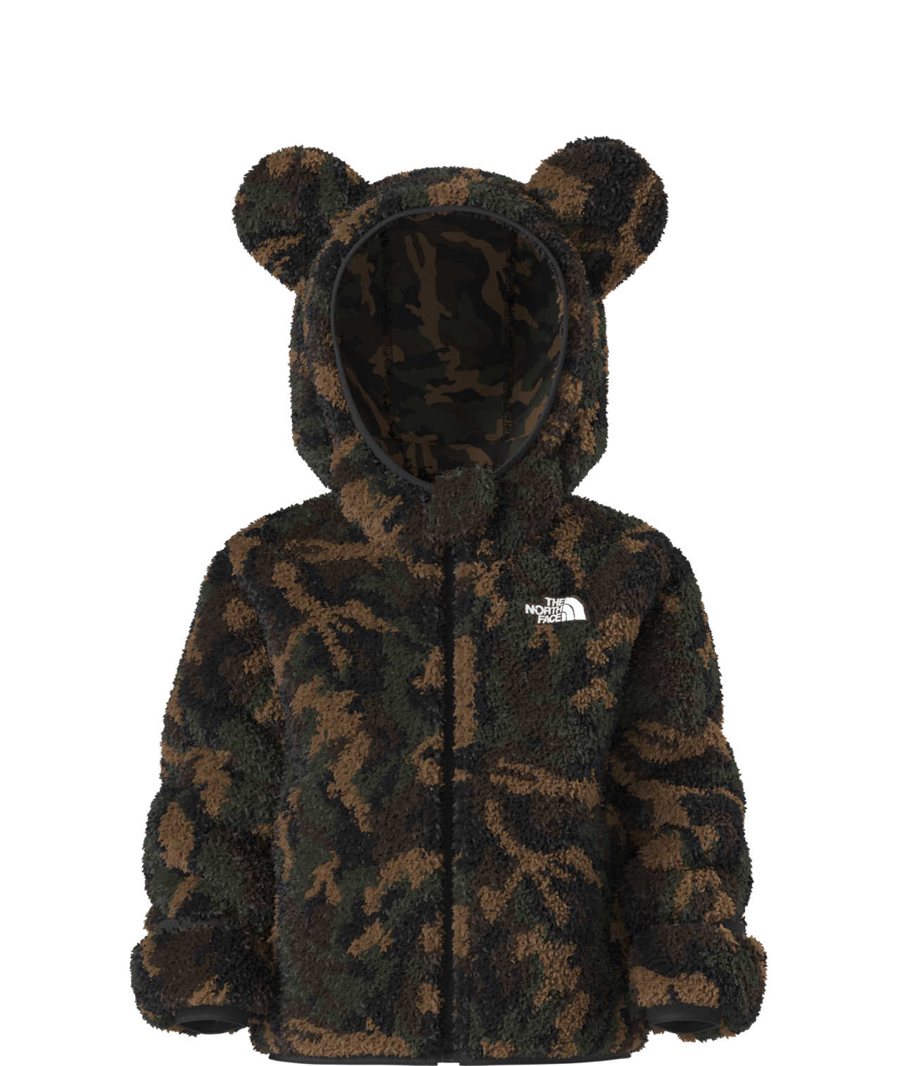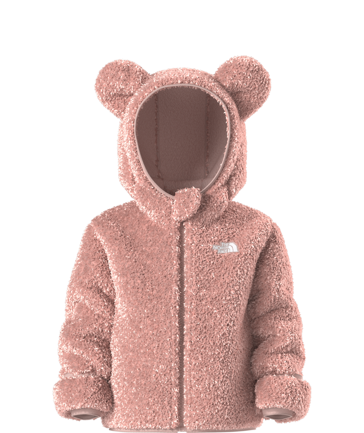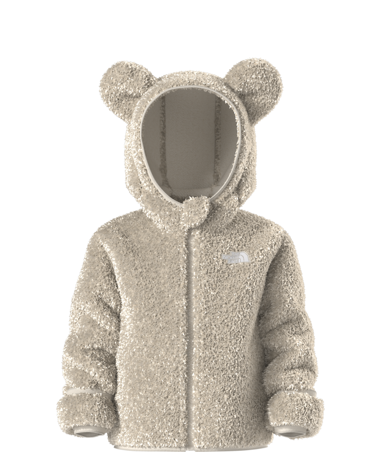 - Attached, three-piece hood with self fabric bear ears